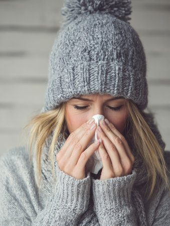 A woman in a knitted hat blows her nose indoors, showing signs of feeling unwell in a warm and inviting space during the winter months.