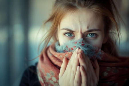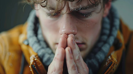 Close-up portrait of a man bundled up in a cozy scarf and hat, experiencing the chill of winter with frost on his breath and hands, capturing an emotional moment.