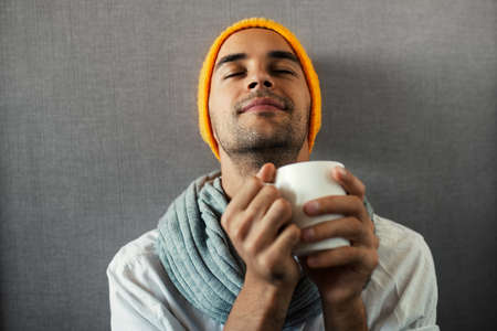 Sitting young handsome man with a mug of coffee, tea, water. Dreaming and smiling with closed eyes on gray background. Wearing orange hat and gray scarf.