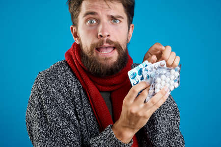 Man with a beard on a blue background in a scarf and in a sweater holds pills, portrait, sickness, sick, flu.