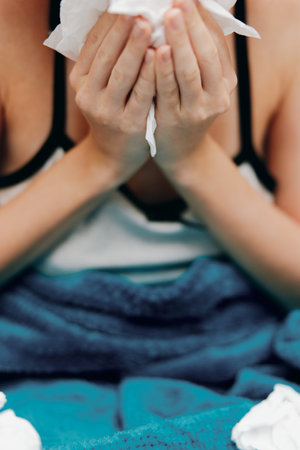 Sick woman blowing nose with tissue while sitting on bed with towel over head