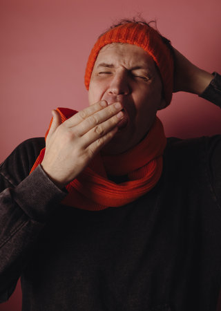 A man stands indoors, wearing an orange hat and scarf. He yawns while holding his hand to his mouth. The background is a soft pink color, indicating a relaxed moment.