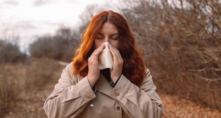 Sick young woman with handkerchief runny nose cold infection at city autumn park. Healthcare, cold, allergy concept