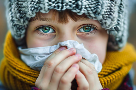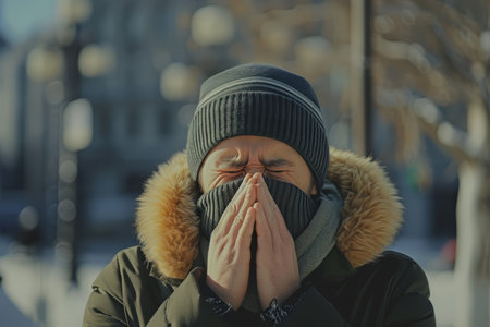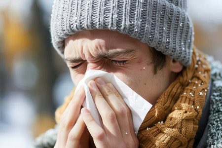 A man appears unwell with a cold, bundled in warm clothes and using a tissue to blow his nose during winter.