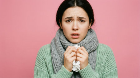 A portrait of an unwell brunette woman with a sad expression, holding a tissue, suffering from seasonal illness symptoms, isolated on a pink studio background.