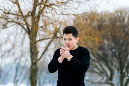 Charming traveler warms his hands in the cold. Snowy forest and rocks. Climbing the mountain in winter. Survival in the wild. high quality photo