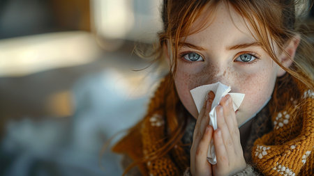 Allergic rhinitis concept with a close-up of a woman sneezing and holding a tissue, emphasizing the impact of allergies.