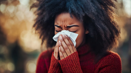 Woman Sneezing into Tissue During Allergy Season in Autumn Park.
