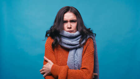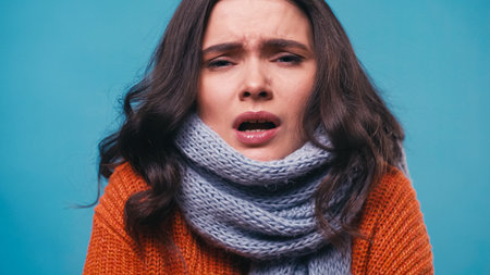 ill woman in knitted scarf sneezing while looking at camera isolated on blue