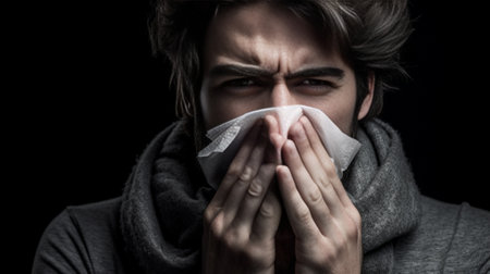 Portrait of ill or sick bearded male sneezes and coughs uses handkerchief rubs nose being allergic to animals Man has running nose caught cold when had walk outdoors in w : Generative AI