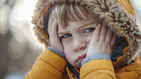 A person stands in a snowy environment, tightly gripping their gloves around their face to shield themselves from the biting cold. The landscape is blanketed in white, evoking a sense of winter chill and frost.