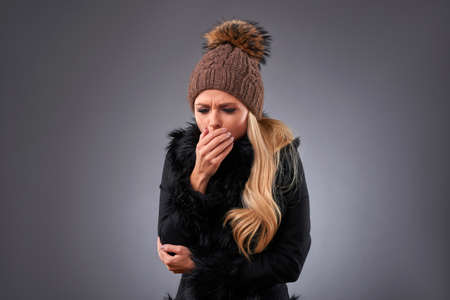 A beautiful young woman standing in an elegant black sweater and a brown hat and coughing