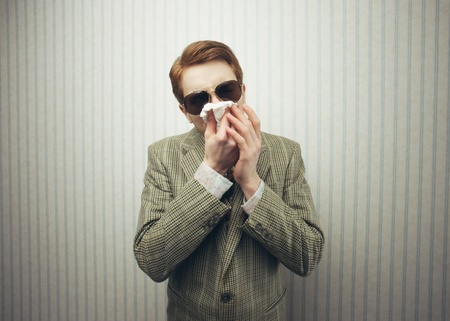 Man suffering from allergic rhinitis blowing his nose with tissue indoors