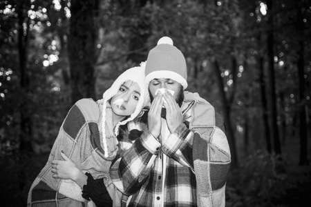 People sneezing in handkerchief autumn outdoor. People got flu, having runny nose. A young couple during disease treatment at autumn park background. Flu season, vaccination.