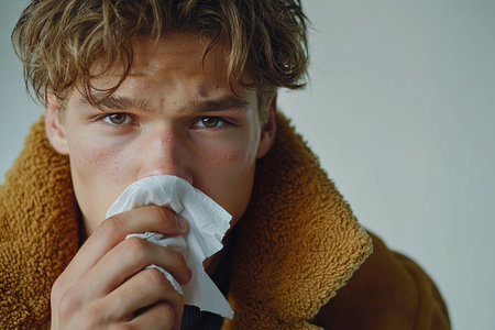 Close up of ill man blowing nose into tissue, providing space for text placement in image