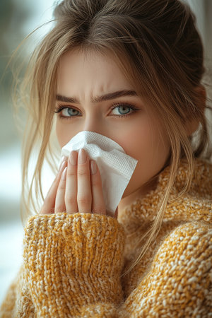Young woman blowing her nose. allergic rhinitis. hay fever