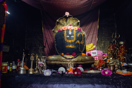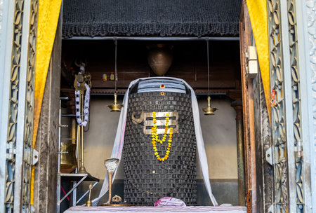 July25th2024, Himachal Pradesh, India. Black stone Shiva Lingam adorned with gold ornaments and serpent god Sheshnag on top, inside the ancient Chaurasi Temple in Bharmour, Himachal Pradesh, India.