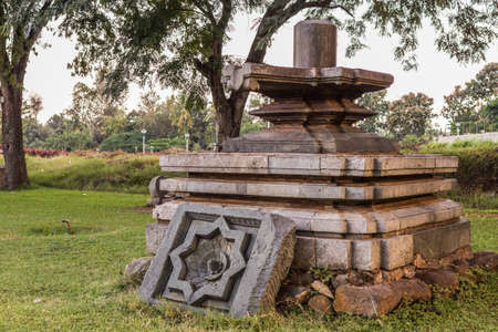 Halebidu, Karnataka, India - November 2, 2013: Hoysaleswara Temple of Shiva. Large old Shivalingam on display on pedestal in temple museum garden.