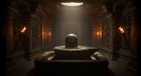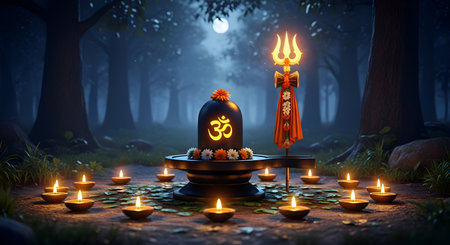A Mahadev Shivling with Trishul and Diyas in Sacred Forest at Night Hindu Lord Shiva Linga Worship with Flowers Om Symbol Maha Shivaratri Festival Spiritual Scene
