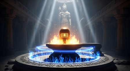 A Glowing Shivling Surrounded by Blue Sacred Fire with Lord Shiva Statue in Temple Divine Energy Mahadev Shankar Bholenath Hindu Spiritual Lingam Worship Meditation