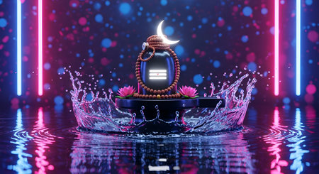 A Modern digital art representation of glowing Shivling with rudraksha mala lotus flowers crescent moon and water splash surrounded by colorful neon lights for spiritual energy concept