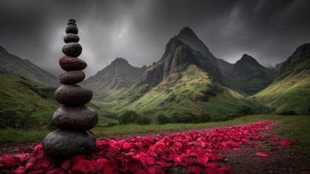 An image displays a balanced stack of stones, set against a backdrop of green hills and imposing mountains. A path of vibrant red petals leads towards the background. The scene is bathed in diffused light, suggesting an outdoor environment, possibly utilized for symbolic, inspirational, or artistic purposes.