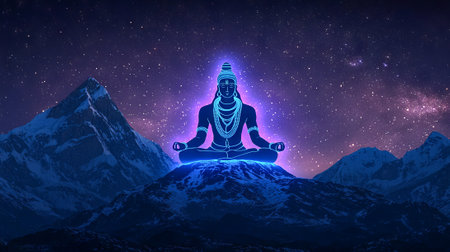 Lord Shiva in deep meditation atop a majestic mountain, surrounded by glowing cosmic energy and a spiritual aura.