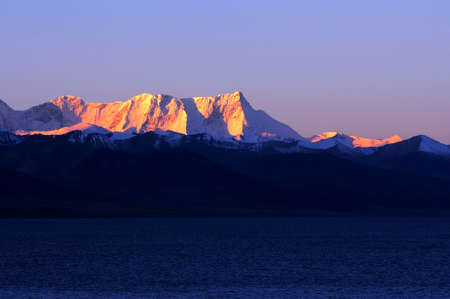 Landscape of snow-capped mountains at lakeside in Tibet at sunrise