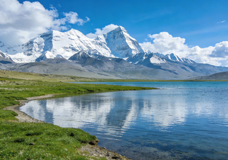 Beautiful mountain landscape with lake and snow-capped peaks in the background