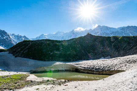 Mountain landscape of Svaneti on bright summer sunny day. Mountain lake, hills covered green grass on snowy rocky mountains background. Caucasus peaks in Georgia. Amazing view on wild georgian nature