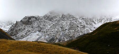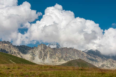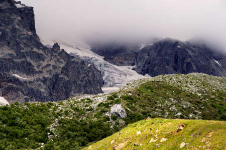 A panoramic view on high Caucasus mountains in Georgia. There are high glaciers in the back. Thick clouds above the sharp peaks. Lush pastures on the sides. Barren peaks. Idyllic landscape.