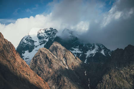 Scenic landscape with great rocks and snowy mountains in sunlight in low clouds. Wonderful view to mountain top with snow in sunshine in cloudy sky. Awesome scenery with sunlit snow-white pinnacle.