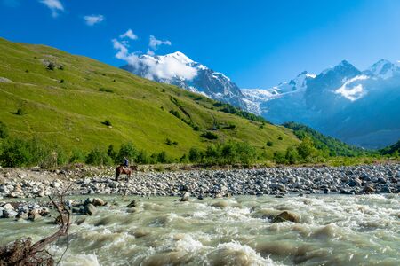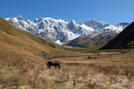 A horse grazing in the meadow in valley. Snowy peaks Dzhangi-Tau and Shkhara with Khalde Glacier in background. During trekking from Khalde to Khalde Glacier. Greater Caucasus, Svaneti, Georgia