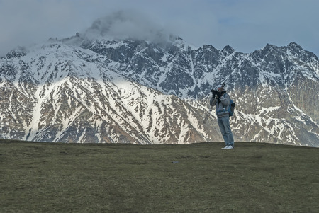 Tourist take a photo at snow mountains in Mestia, Georgia.