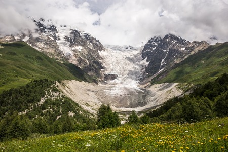 View of a mountain glacier from alpine meadows in the Caucasus mountains.