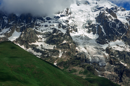 A panoramic view on the snow-capped peak of Jangi-Tau(Dzhangi-Tau) in the Greater Caucasus Mountain Range in Georgia, Svaneti Region. Snowy and glaciated terrain. Mountaineering, freedom, wanderlust.