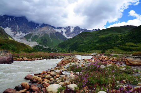Svaneti landscape with glacier and snow-capped mountain in the back and flowers in the foreground near Mestia village in Svaneti region, Georgia.