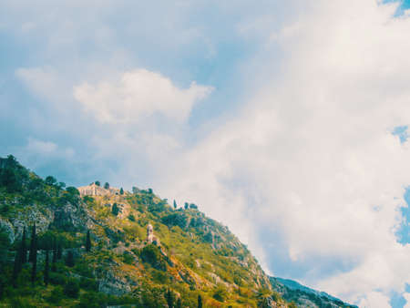 Montenegro. Kotor. 16.05.2020 View of the city of Kotor from the mountain Ladder of Kotor, San Giovanni castle view. Mountains sea and bay.