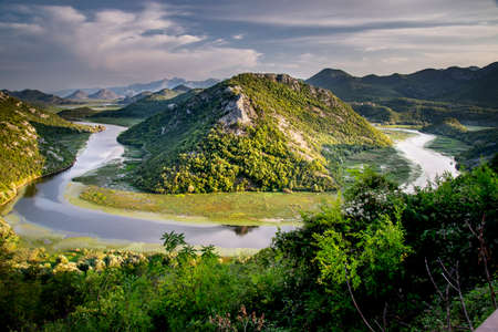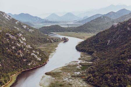 Top view of Rijeka Crnojevica flowing through mountains. Location place National park Skadar Lake, Montenegro, Balkans, Europe. Scenic image of popular travel destination. Explore the beauty of earth.