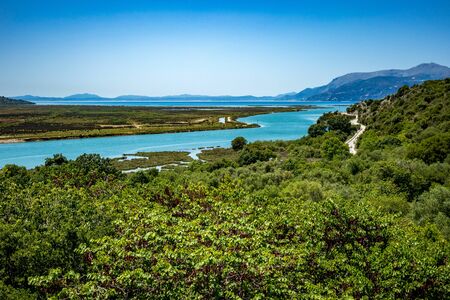 High angle sunny spring day view of salt lagoon lake in the national park of Butrint in Albania, Europe
