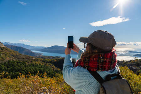 Female hiker taking photo of the scenic panoramic view of Jinvali water reservoir, Aragvi river, Georgia