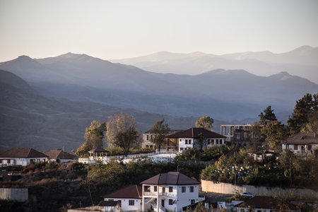 Castle of Gjirokastra and Old town of Gjirokaster at sunrise in Southern Albania. Popular Albanian travel destination