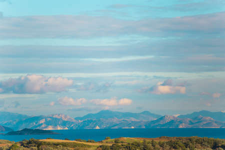 Beautiful view of the sunset and the natural landscape with the sea and hills or mountains in Montenegro.