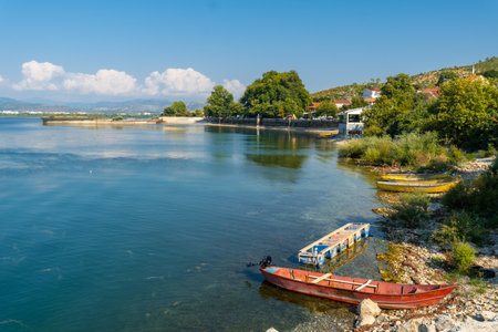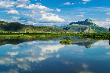 Spring day in Albania. View of banks of Buna River, Lake Shkoder and city of Shkoder