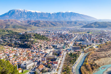 Daytime panoramic cityscape with dense residential neighborhoods, central streets, riverside park and urban sprawl across the valley with surrounding mountains, Berat, Albania