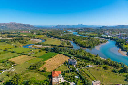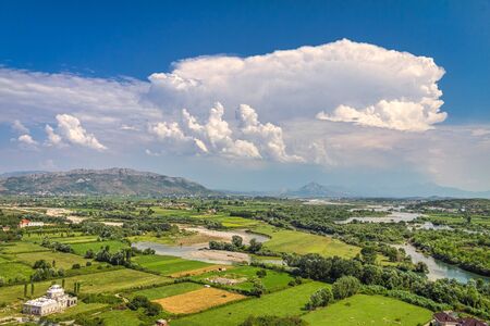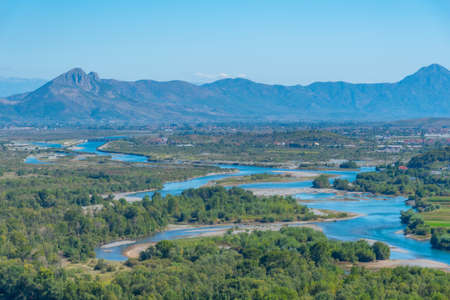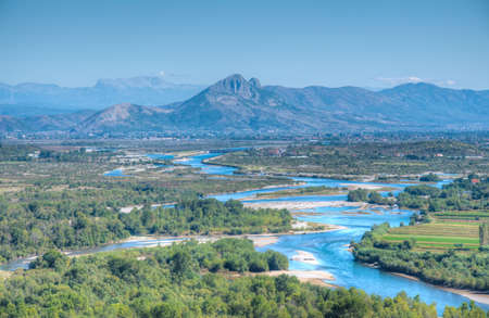 Landscape with river basin and mountain range on background near Shkoder town, Albania, Europe.