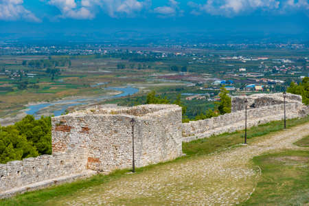 The walls of Rozafa Castle and its citadel in the city Shkoder along the lake river. Albania