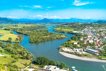Aerial view from the Rozafa fortress at the confluence of the Buna and Drin rivers in Albania. Beautiful nature in the Albanian countryside in summer