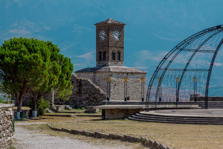 Gjirokaster town / Albania –August 2, 2020: View of clock tower and stone walls at Castle complex. UNESCO world heritage landmark in Albania.