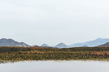 Nature views of Lake Skadar National Park in Montenegro. Water and green mountains panorama